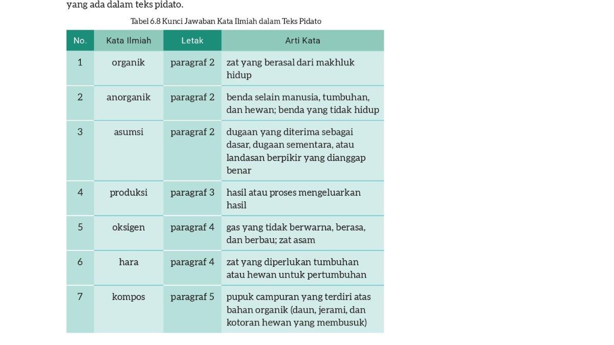Tugas kedua dalam Berlatih adalah mencari kata-kata ilmiah dalam teks pidato “Masalah Sampah”, kemudian menuliskannya dalam tabel beserta artinya. Berikut adalah beberapa contoh kata ilmiah yang ditemukan:
