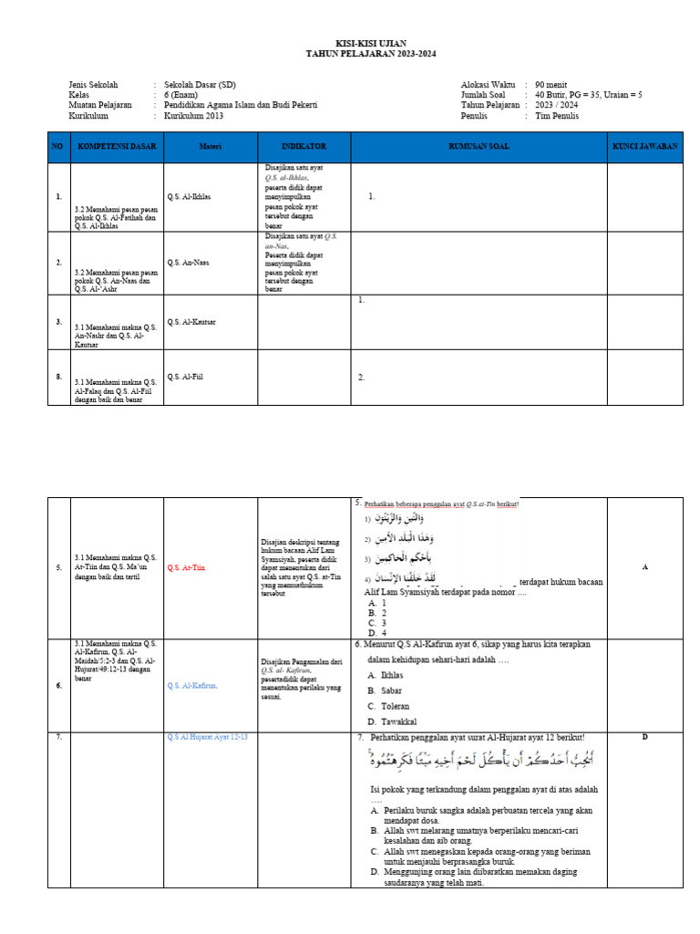 Berikut beberapa contoh soal ujian sekolah PAI kelas 6 SD/MI beserta kunci jawabannya: